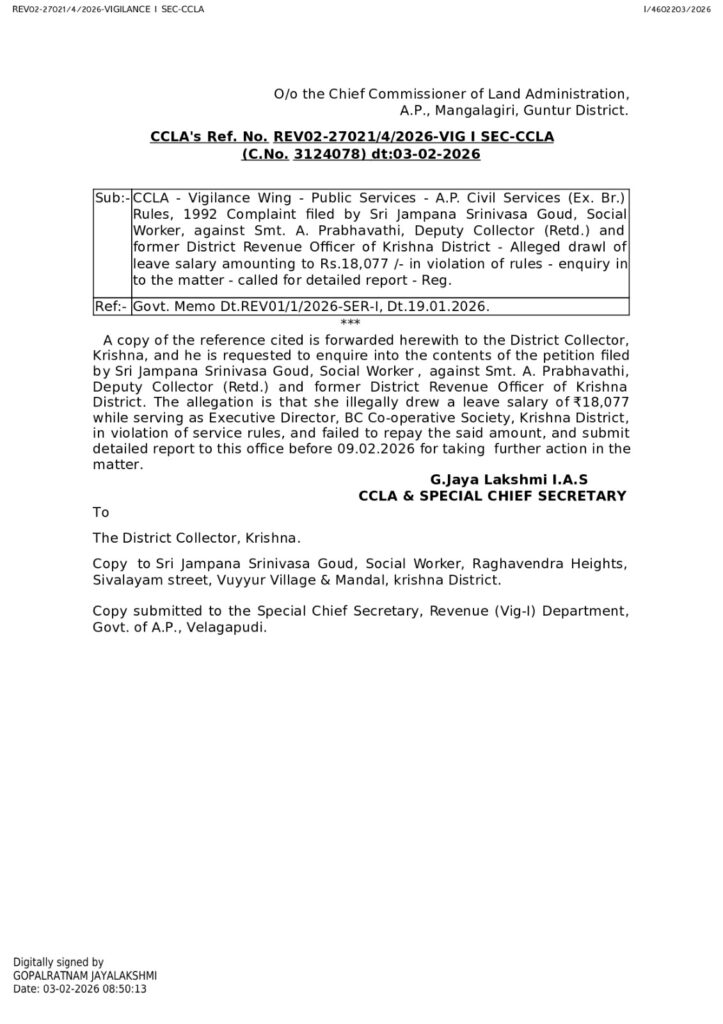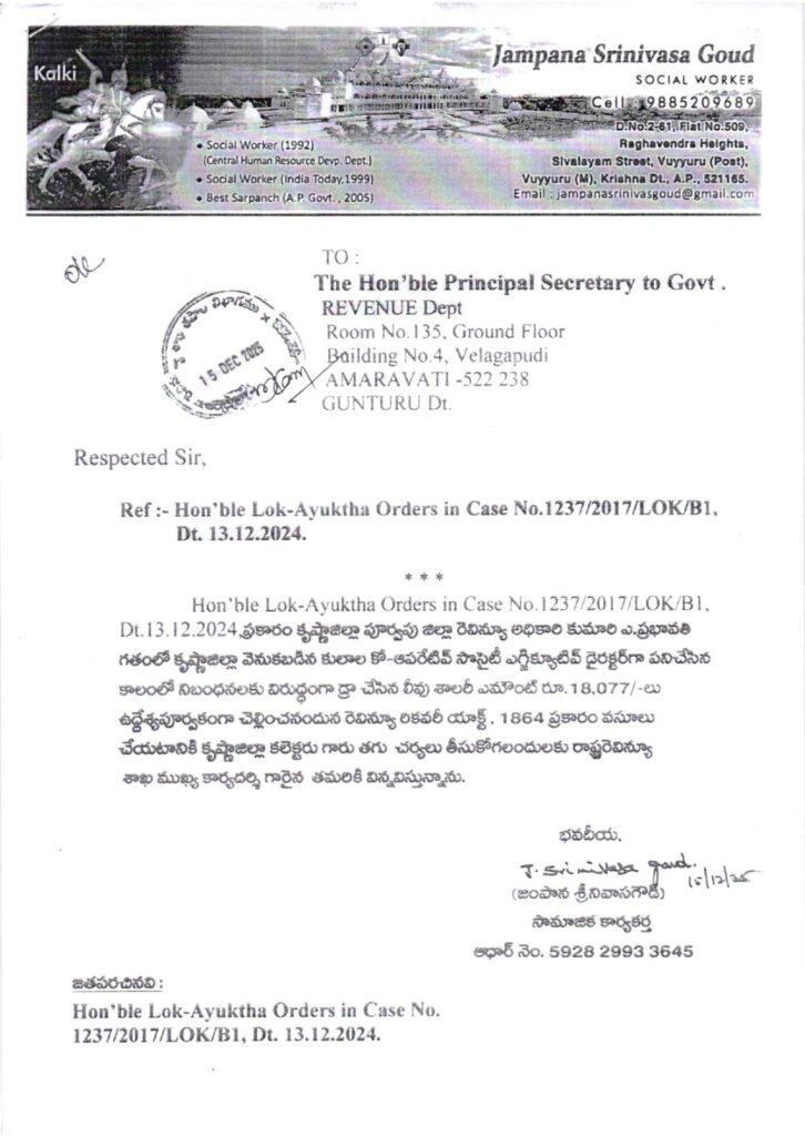 లోకాయుక్త కేసు 1237/2017/LOK/B1 (13.12.2024) ప్రకారం, మాజీ రెవెన్యూ అధికారి ఎ.ప్రభావతి వెనుకబడిన కులాల కో-ఆప్ సొసైటీ ఎడీఆర్‌గా ఉన్నప్పుడు నిబంధనలకు విరుద్ధంగా డ్రా చేసిన లీవు శాలరీ రూ.18,077 రికవరీ చేయాలని కృష్ణా కలెక్టర్‌కు ఆదేశం.