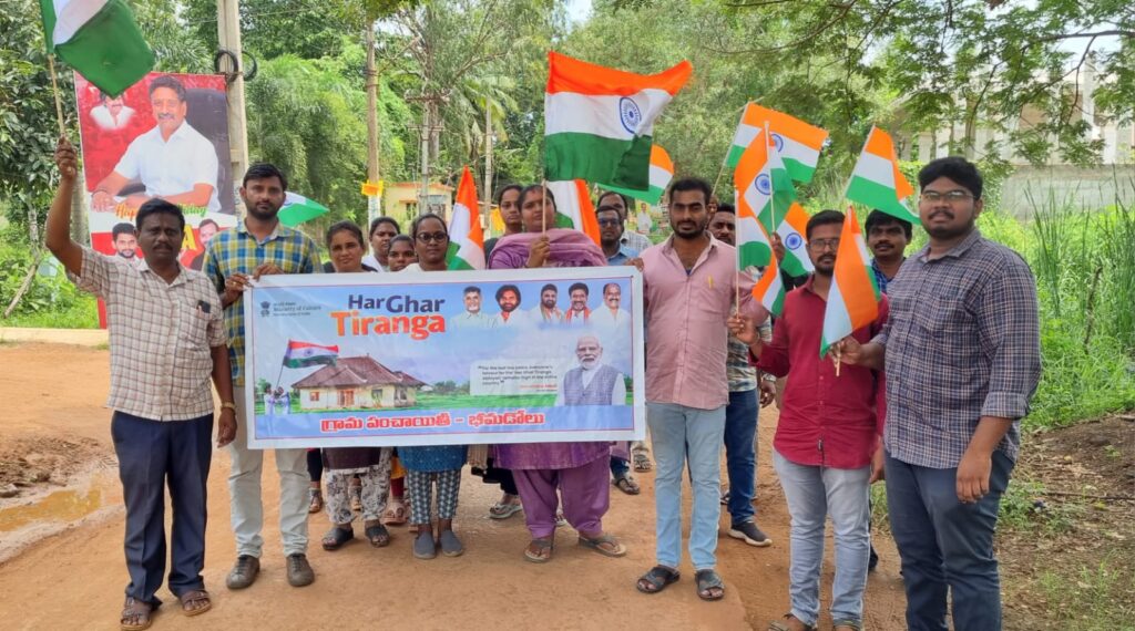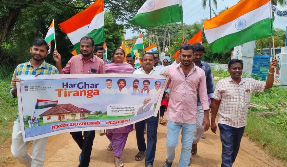సోమవారం ‘హర్ ఘర్ తిరంగా’ కార్యక్రమంలో భాగంగా భీమడోలు పంచాయతీ కార్యాలయం నుంచి గాంధీ బొమ్మ వరకు సచివాలయ, పంచాయతీ సిబ్బంది, ప్రజాప్రతినిధులు, గ్రామస్థులతో కలిసి జాతీయ జెండాలతో ర్యాలీ నిర్వహించారు.