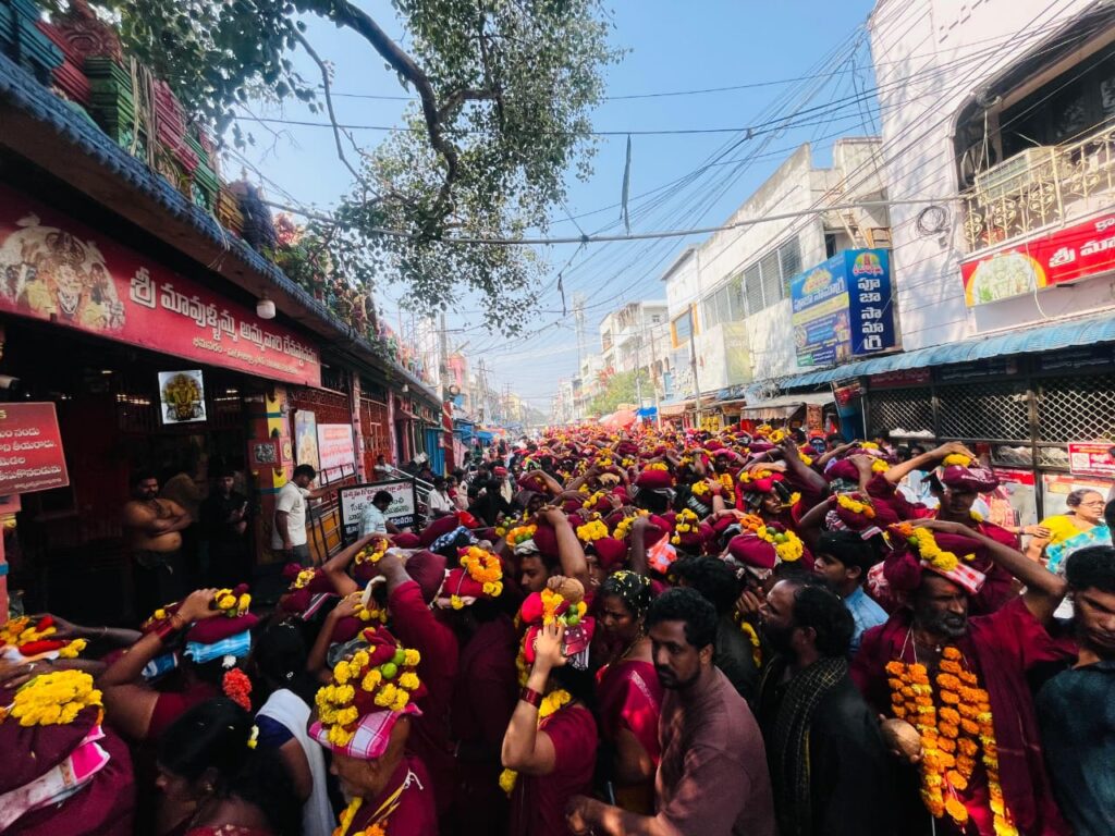 After the main ceremony, the Irumudi-bearing devotees circumambulated the temple thrice, passing through Potti Sriramulu Junction, Andhra Bank, Taluka Office, and the Mavullamma Temple streets before returning to the shrine. Over 3,000 devotees received annaprasadam in a mass distribution program.