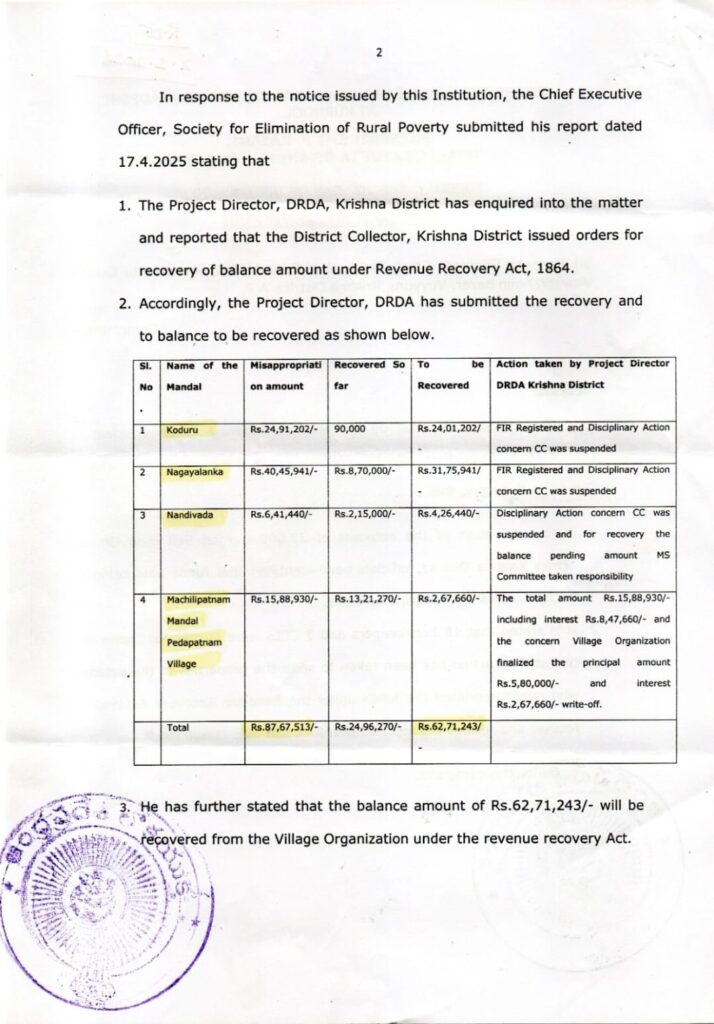 కృష్ణాజిల్లాలోని వివిధ 4 మండలాలలో రూ.87,67,513/-లు వివిధ డ్వాక్రా సంఘాల నిధులు దుర్వినియోగం కాగా.. రాష్ట్ర లోకాయుక్త జస్టిస్ పి. రజని ఆదేశాలతో రూ.62,71,243 /- లు తిరిగి వసూలు కాబడ్డాయి.