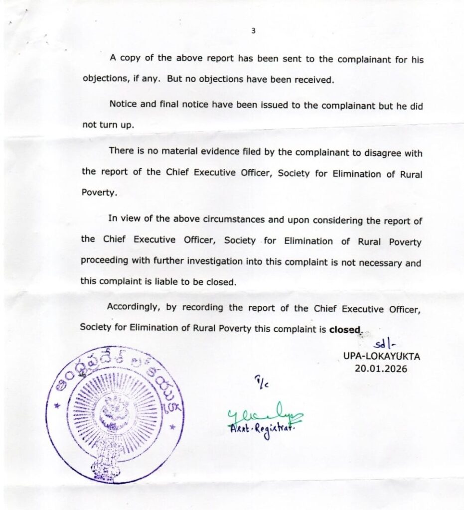 ఉయ్యూరుకు చెందిన సామాజిక కార్యకర్త జంపాన శ్రీనివాస గౌడ్..రాష్ట్ర లోకాయుక్తకు 2023లో చేసిన పిర్యాదు మేరకు సెర్ఫ్ సి.ఇ.వో వాకాటి కరుణ, కృష్ణాజిల్లా డి.ఆర్.డి.ఎ. ప్రాజెక్టు డైరక్టర్ విచారణ జరిపి రెవిన్యూ రికవరీ చట్టం ప్రకారం రూ.62,71,243 /- లు తిరిగి వసూలు చేసారు.