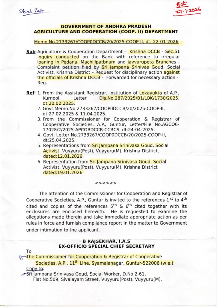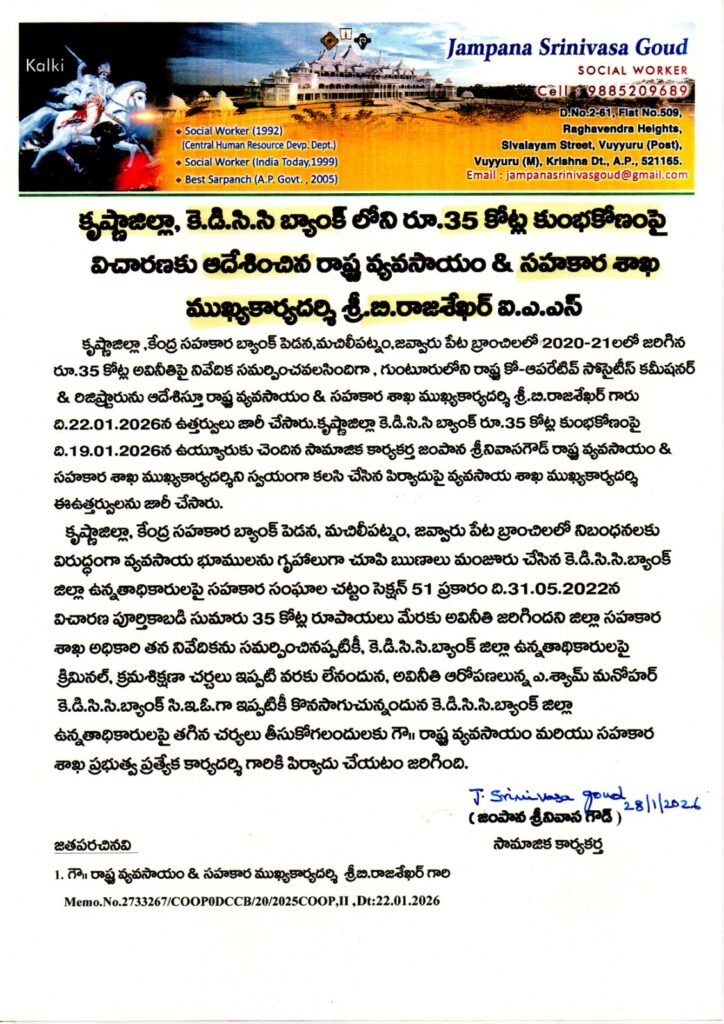 State Agriculture & Cooperation Principal Secretary B. Rajasekhar IAS has ordered an inquiry into a ₹35 crore scam at Pedana Central Cooperative Bank’s Javvarupeta branch during 2020-21. Guntur Cooperative Societies Commissioner must submit a report by January 22, following orders issued on the same day.The fraud surfaced via a January 19 complaint by Uyyuru activist Jampana Srinivas Gowd. KDCSCB officials allegedly approved loans by misrepresenting agricultural lands as homes, violating Cooperative Act Section 51. A 2022 probe concluded on May 31, but no criminal or disciplinary action followed, allowing CEO A. Shyam Manohar to continue. Activists demand accountability from top bank officials.