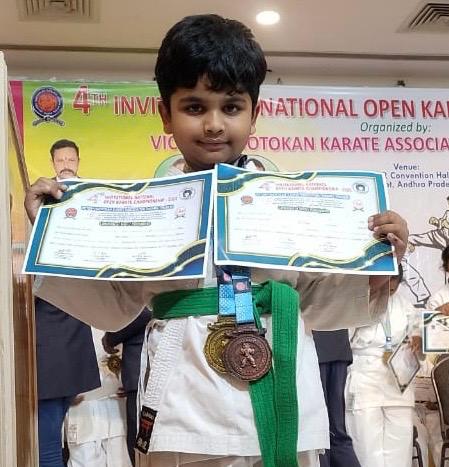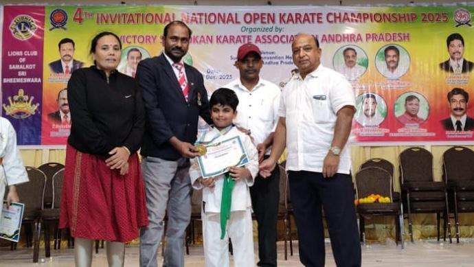 In a stellar performance at the 4th National Level Open Karate Championship-2025, hosted by Victory Shotokan Karate Association (AP) in Samalkot, Kakinada district, six-year-old Toufik Aman from Vijayawada clinched gold in the Green Belt Kata category and bronze in Kumite. A first-grader at Ravindra Bharathi Public School, Prasadam Padu, Aman continues to dominate at the national level.