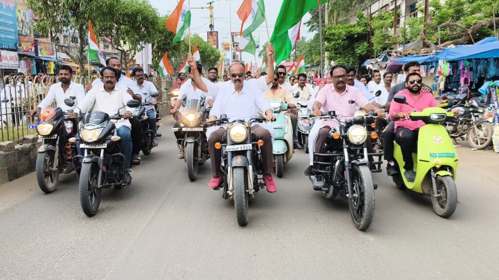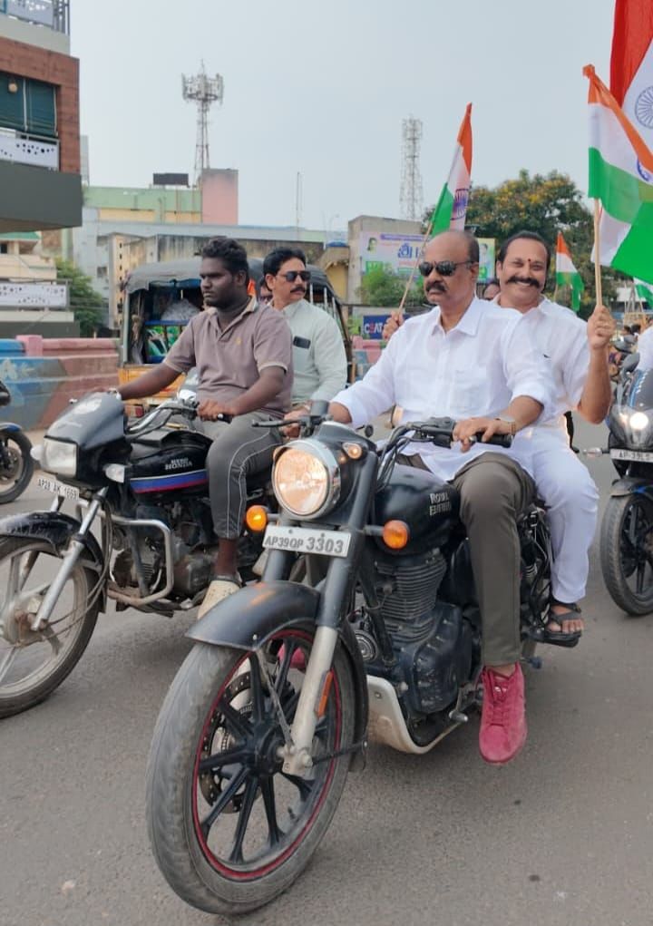 మంగళవారం తాడేపల్లిగూడెం నియోజకవర్గం ఎన్.డి. ఏ కూటమి నాయకులు కార్యకర్తలు వీర మహిళలతో ప్రజలతో ఎమ్మెల్యే బొలిశెట్టి శ్రీనివాస్ ఆధ్వర్యంలో తిరంగా భారీ బైక్ ర్యాలీ పాల్గొన్నారు .ఈ ర్యాలీను హౌసింగ్ బోర్డ్ ఎస్వి రంగారావు విగ్రహం నుండి పోలీస్ ఐలాండ్ మోడరన్ కేఫ్ వరకు జాతీయ జెండాలతో బైక్ ర్యాలీ ర్యాలీ నిర్వహించారు.