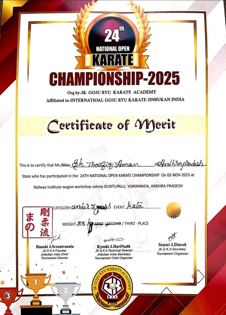JK GOJU RYU కరాటే అకాడమీ వారి ఆధ్వర్యంలో నిర్వహించబడిన 24 వ జాతీయ స్థాయి ఓపెన్ చాంపియన్ షిప్ పోటీలలో కటా మరియు కుమ్ముతే విభాగంలో 6 సంవత్సరాల వయస్సు ఉన్న షేక్ తౌఫిక్ అమన్ రెండు విభాగాల్లోనూ జాతీయ స్థాయిలో మూడవ స్థానం సాధించడమైనది.