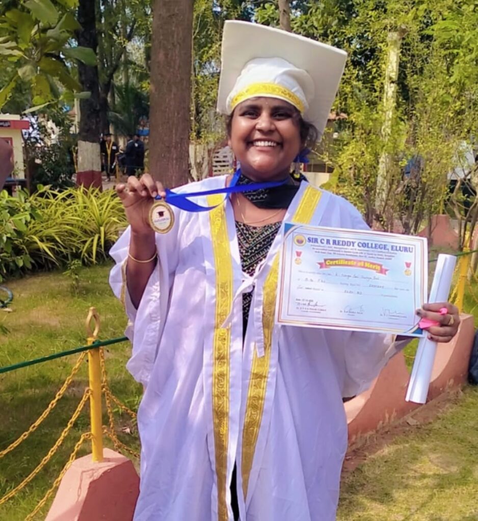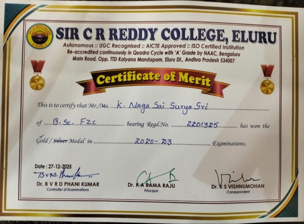 2020-2023 ఏలూరు CR REDDY కాలేజ్ లో BSC (FZC) ఫిషరీస్ డిపార్ట్మెంట్ లో టాపర్ – గోల్డ్ మెడల్ సాధించిన K. నాగసాయి సూర్యశ్రీ(REGD 2201325).