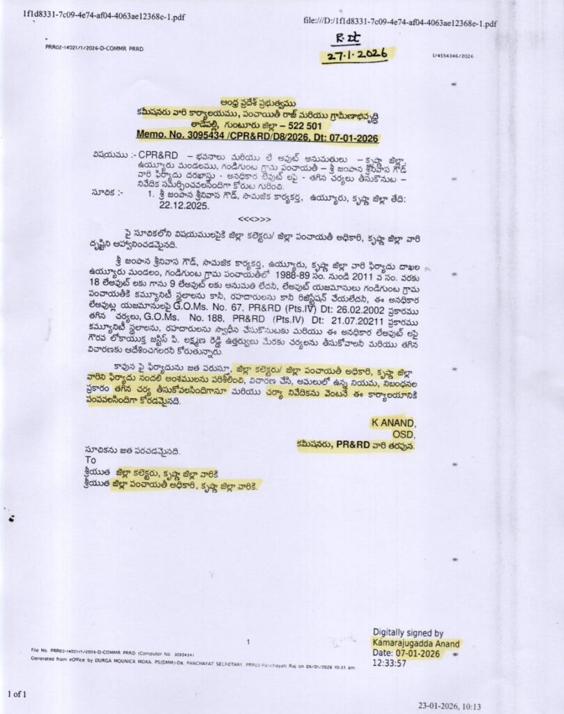 ఉయ్యూరు సామాజిక కార్యకర్త జంపాన శ్రీనివాస్గౌడ్ 22.12.2022 పిర్యాదుపై కమిషనర్ ఓ.ఎస్.డి.కె.ఆనంద్ ఉత్తర్వులు జారీ చేశారు.ఇటీవల 22.12.2025 పిర్యాదుతో పంచాయతీ కార్యదర్శులు, విస్తరణాధికారులు, డి.ఎల్.పి.వోలు, కలెక్టర్ల పై విచారణకు ఆదేశించాలని కమిషనర్, ముఖ్య కార్యదర్శి శశిభూషణ్కుమార్కు జంపాన విజ్ఞప్తి చేశారు.