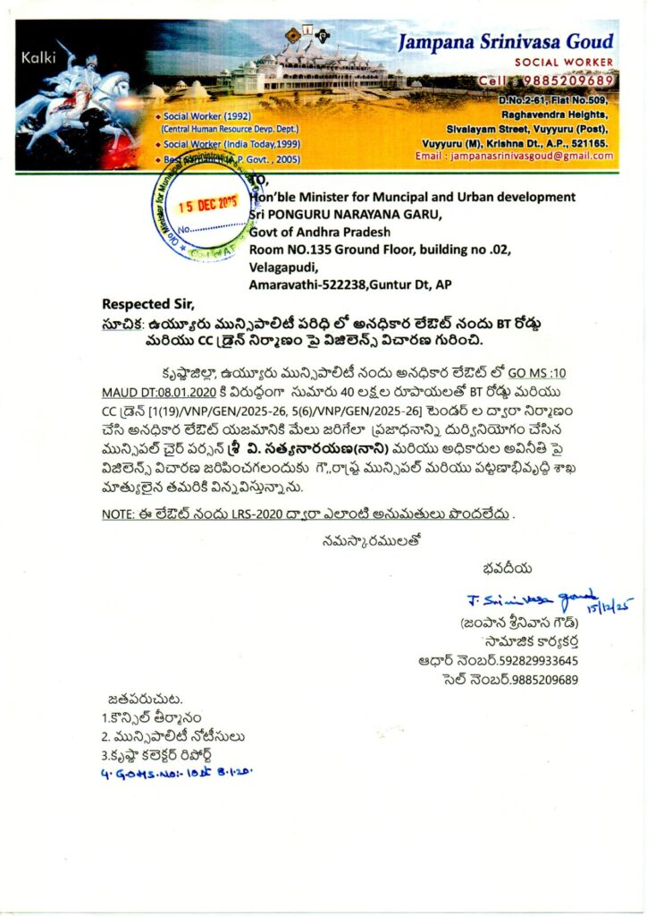 ఉయ్యూరు మున్సిపాలిటీ పరిధి లో అనధికార లేఔట్ నందు BT రోడ్డు మరియు CC డ్రైన్ నిర్మాణం పై విజిలెన్స్ విచారణ గురించి ఉయ్యూరు మున్సిపాలిటీ నందు అనధికార లేఔట్ లో GO MS :10 MAUD DT:08.01.2020కి విరుద్ధంగా సుమారు 40 లక్షల రూపాయలతో BT రోడ్డు మరియు CC ໕໓ [1(19)/VNP/GEN/2025-26, 5(6)/VNP/GEN/2025-26] చేసి అనధికార లేఔట్ యజమానికి మేలు జరిగేలా ప్రజాధనాన్ని దుర్వినియోగం చేసిన మున్సిపల్ చైర్ పర్సన్ వి. సత్యనారయణ (నాని) మరియు అధికారుల అవినీతిపై విజిలెన్స్ విచారణ జరిపించగలందుకు రాష్ట్ర మున్సిపల్ మరియు పట్టణాభివృద్ధి శాఖ మంత్రికి.. సామాజిక కార్యకర్త జంపాన శ్రీనివాస్ గౌడ్ ఫిర్యాదు చేయగా..